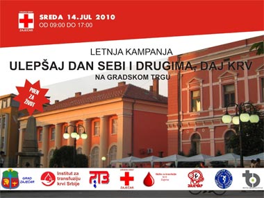 slogan je ovogodišnje Letnje kampanje prikupljanja krvi koju organizuje Institut za transfuziju krvi Srbije i B92 u gradovima i opštinama Srbije. Ova akcija će biti organizovana u Zaječaru 14.jula od 09.00 do 17.00 h na Gradskom trgu, gde će biti postavljen autobus Instituta za transfuziju krvi Srbije i B92. Zaječarska Služba za transfuziju krvi i Grad Zaječar apeluju na sugrađane da se u što većem broju priključe Letnjoj kampanji, zbog činjenice da su potrebe za krvlju u letnjem periodu povećane. Svakodnevno je potrebno oko 1000 jedinica krvi u celoj Srbiji , što znači da na svakih 100 sekundi neki bolesnik, u nekoj bolnici u Srbiji, treba da primi krv. Ovo je dovoljan razlog da se 14. jula vidimo na Gradskom trgu.